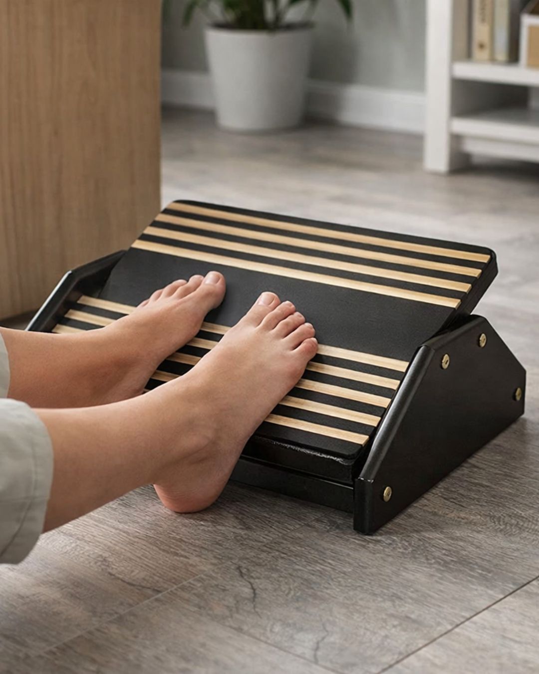 Com plataforma resistente em plástico, ele oferece inclinação ajustável, permitindo adaptar o ângulo de apoio conforme a sua necessidade. Esse ajuste ajuda a manter os pés bem posicionados, favorecendo a circulação sanguínea e diminuindo a pressão nas pernas e na lombar.