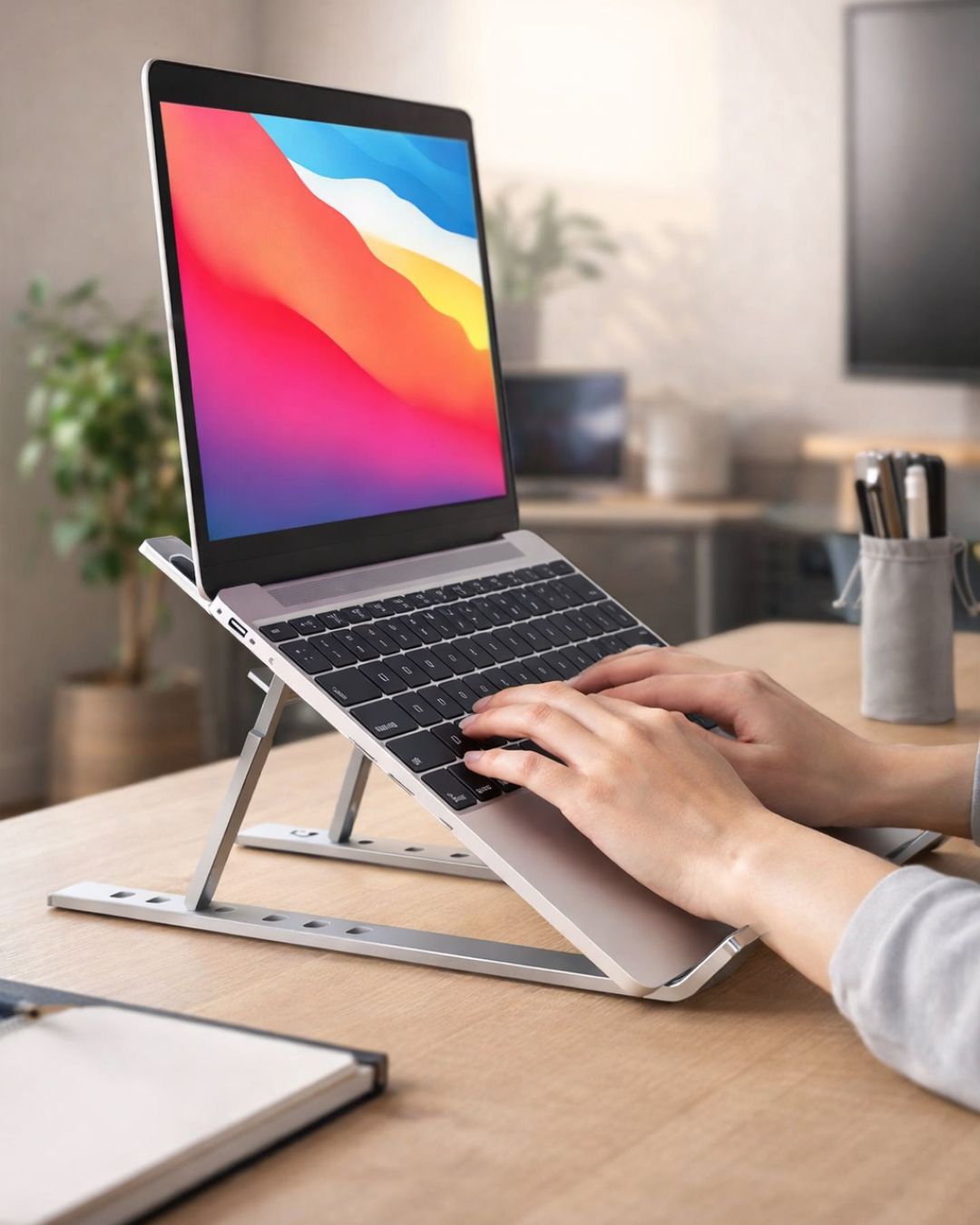 Suporte para Notebook em Alumínio Dobrável e Ajustável – Ergonômico, Portátil e Compatível com Diversos Modelos