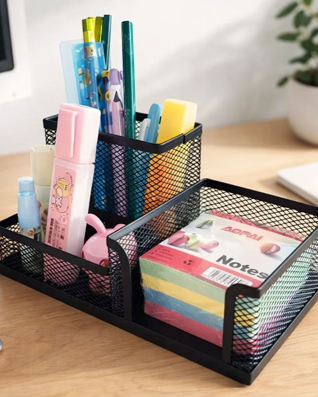 Fabricado em estrutura metálica aramada, ele oferece resistência, durabilidade e ventilação adequada para os itens armazenados, evitando acúmulo de poeira. Seu formato inteligente permite organizar canetas, lápis, marcadores, post-its, papéis, blocos de notas e pequenos objetos, deixando tudo sempre à mão.